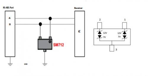 2、RS485接口 对RS485接口的特点是收发电平的不对称,为7V 和12V,所以需要专门设计不对称的保护芯片,而SM712 SOT-23封装,专为保护具有非对称工作电压(-7V至12V)的RS-485应用而设计,使其免受静电放电(ESD)、电气快速瞬变(EFT)和雷电引致的浪涌电流带来的危害。 它能吸收高于IEC 61000-4-2国际标准规定之最高级别的反复性ESD放电 30KV,无需担心其性能发生减退,并可在极低的箝位电压下安全地耗散19A的8/20μs波形浪涌电流(IEC61000-4-5)。