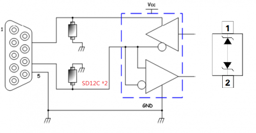 3、RS232接口 RS232接口一般为内部配置接口,或短距离低速通信口,但此接口经常插拔,需要采用功率300W以上产品进行静电和浪涌保护,所以需采用SOD-323封装的SD12C或SD15C(根据客户芯片的工作电压波动不同)来保护收发2路信号。