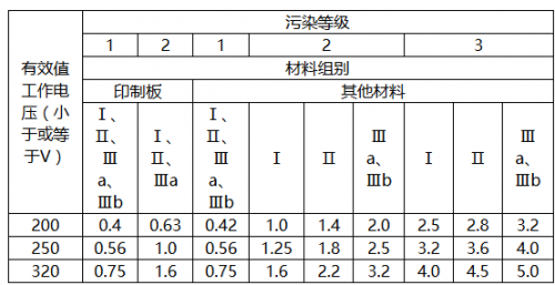 2、首先确定污染等级,再根据实测两点峰值工作电压B和上述确认的交流电网电源瞬态电压值可确定最小电气间隙为C1(由表2K确定);