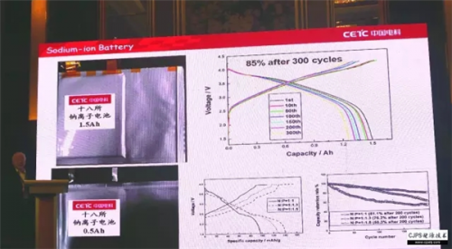 我们做了1.5Ah和0.5Ah两种软包全电池,正极材料采用前面提到的镍锰氧化物,负极采用生物质的硬碳材料,经300次循环后容量衰降为15%。由此可见,钠离子电池用廉价材料是可以制备的,而且电性能良好。