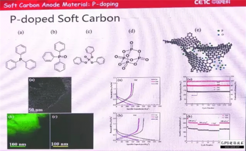 负极方面,由于软碳材料处理的方法比较多,我们尝试了用磷掺杂软碳。掺杂磷后放电容量可以提高30%以上,循环特性好。为什么掺磷后材料性能提高呢?这是由于掺磷后可以增加钠吸附的活性点。在传统的嵌入反应之外,还多了一些钠离子吸附的活性点位。另外,在硬碳方面,我们选用了椰壳、杏壳等生物质材料,通过处理,最终获得硬碳材料。通过拉曼分析可以发现,这些材料是短层有序、长层无序的结构,微晶的层间距较大,适合钠离子嵌入。通过循环实验可以看到,经过200次循环,容量基本没有衰降,循环稳定性很好。由此可见,这些生物质材料是很好的廉价的钠离子电池负极材料。再有,对于石墨烯负极我们也做了研究。石墨烯材料最大的问题是密度比较低,将来能不能做成高体积比能量的电池还是问题。所以可以考虑将石墨烯和其他负极材料如硬碳、软碳,以及化合物类或合金类材料进行复合。