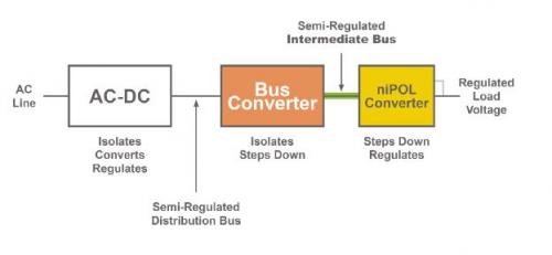 图字:交流线路;隔离,转换,调节;半调节配电总线;总线转换器;隔离,降压;半调节中间总线;niPOL转换器;降压,调节;调节负载电压