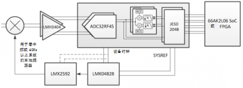 ADC32RF45是射频采样接收机的核心与灵魂所在。它具有-155dBFS/Hz的噪音基底,使信号直接采样的射频频率达到4GHz;但是它需要一个高品质的采样时钟,从而避免由高中频结构所实现动态范围的下降。对于4GHz以上的信号,可借助射频合成器在宽带高中频结构或零中频结构中使用ADC32RF45。高采样速率,加上单一封装中的两个通道,意味着您可以使用最小的2GHz信号带宽的零中频接收机,并最小化ADC通道间的I/Q不匹配现象,不过这需要激励放大器的帮助,激励放大器也需要非常小且匹配性高。