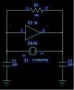 其中,Y1是晶体,相当于三点式里面的电感;C1和C2是电容,而5404和R1则实现了一个NPN型三极管(大家可以对照高频书里的三点式电容振荡电路)。