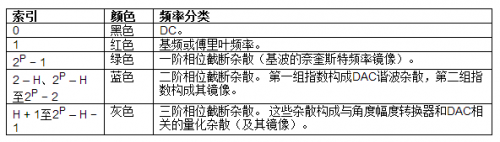 图1. DDS功能框图 相位截断 累加器和FTW组成DDS的频率控制元件。 但是,除了频率控制元件外,DDS还具有将N位累加器输出从相位值转换为幅度值的角度转幅度模块。 角度转幅度模块占据了DDS数字电路的很大一部分。 因此,通过增大N来提高DDS的调谐分辨率会大幅增加角度转幅度模块所需的电路数。 同样,将所有N位相位信息转换为幅度不太实际。 如图1所示,实际DDS使用累加器位的子集进行相位幅度转换,即P最高有效位(MSB)。 这种位截断会大幅减少角度转幅度模块所需的电路数。 但代价是需要在DDS输出端引入可能的频谱伪像(具体而言就是相位截断杂散)。 相位截断杂散 根据定义,按P = N设计的DDS没有相位截断。 因此,其输出频谱中没有相位截断杂散。 但是在实际DDS中,P < N,这会产生相位截断。 有三类相位截断杂散: 一阶、二阶和三阶。 这几个分类源于DDS中相位幅度转换器和数模转换器(DAC)的级联组合的频谱特性。 图2结合图形说明将傅里叶变换技术应用于角度转幅度模块(带P位相位输入)和呈现谐波失真的非理想DAC所产生的谱线。 一般而言,频谱由2P个频率构成,指数范围为0至2P − 1,分类详情如表1。