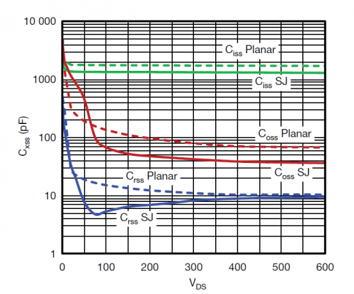 图5还显示了超级结器件的Coss低近40%,导致更少的储存能量和更快的开关速度,同时实现更低损耗。所有MOSFET的输出容值Coss均表现出与施加电压VDS有关的非线性特征。这种非线性在超级结MOSFET情况下更显著,具有100:1的变化率,电压值的范围为0 V – 600 V。这给需要针对Coss储存电荷和能量有效值的设计工程师带来了挑战。超级结器件产品数据表通常提供针对Coss的两个有效值,定义如下: