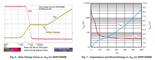 这种简单模型不能用于超级结器件,超级结器件的结构和开关行为更为复杂。例如,图6显示了SiHP33N60E的栅极电荷曲线,VDS曲线叠加于其上。与平面式器件相比,超级结MOSFET的一个特征是其容值(VDS的函数)的宽变化范围。在超级结MOSFET中,由于Crss在0 V – 600 V范围内的100:1下降,所以观察到的开关持续时间远小于从产品数据表Qgd值估计得到的数据。虽然没有分析方法可用来预测实际过渡时间(这取决于应用条件),但设计工程师应当知道可使用更低栅极驱动电流来实现优异的开关性能。与平面式MOSFET器件相比,这使超级结器件可使用尺寸更小、成本更低的栅极驱动器。