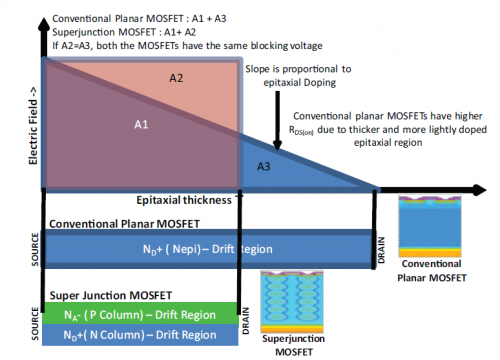 对于给定的阻断电压,超级结MOSFET可使用比传统平面式器件(A1 + A3)更薄的epi(A1 + A2)。N区(ND+)的掺杂被P柱(NA-)的掺杂抵消,导致没有斜率。换言之,因为电荷平衡机制,定义阻断电压的只有epi厚度。因此,超级结结构的导通电阻和击穿电压之间存在线性关系。导通电阻随着击穿电压的增加而线性增加。对于相同的击穿电压和管芯尺寸,超级结MOSFET的导通电阻远小于传统平面式器件。