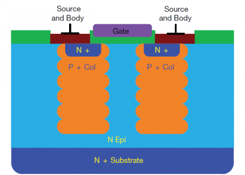 图2显示了基于电荷平衡概念的超级结MOSFET物理结构。漂移区现在有多个P柱,用于消除处于反向偏压下的周围N区中的电荷。因此,Nepi现在可更薄和重掺杂,因为其组合结构可对施加反向电压提供高很多的电阻。由于N区变得更加重掺杂,所以其单位面积导通电阻减小。