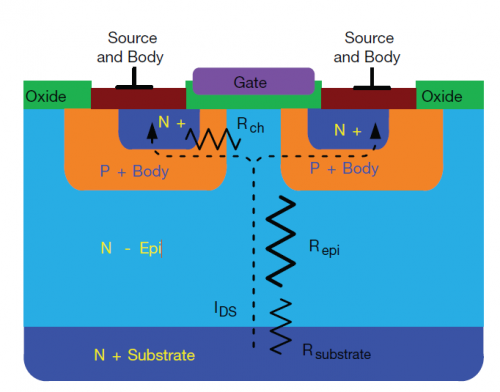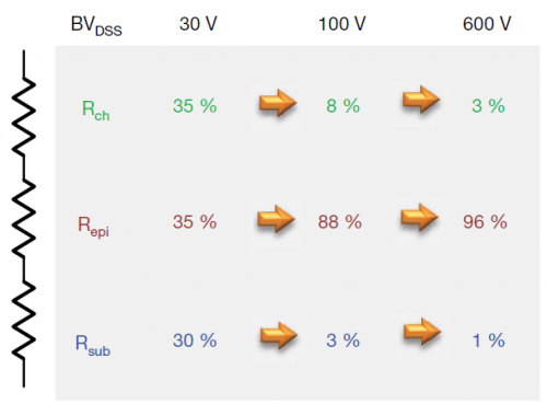 图1b显示平面式MOSFET情况下构成RDS(on) 的各个分量。对于低压MOSFET,三个分量是相似的。但随着额定电压增加,外延层需要更厚和更轻掺杂,以阻断高压。额定电压每增加一倍,维持相同的RDS(on)所需的面积就增加为原来的五倍以上。对于额定电压为600 V的MOSFET,超过95%的电阻来自外延层。显然,要想显著减小RDS(on)的值,就需要找到一种对漂移区进行重掺杂的方法,并大幅减小epi电阻。