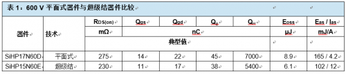 表1比较了具有接近RDS(on)值的两种器件的特征。除Eas和Ias外,超级结器件的每个参数均实现15 % – 25 %的改善。这是因为超级结器件虽然RDS(on)只减小了20%,但其管芯尺寸只有平面式器件的三分之一。更小的尺寸会影响额定电流和功率。大管芯尺寸具有更低的电流密度和更好的散热能力。因此,对于给定的导通电阻,传统平面式MOSFET天生比超级结器件更坚固。但在通常用于高压电源转换器的电流和开关频率下,超级结器件始终具有更低的损耗和更高的效率。