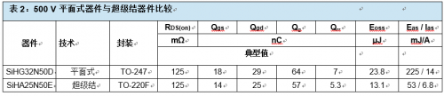 表2显示了500 V器件的比较。SiHG32N50D是一款具有125 m?典型RDS(on)额定值的平面式MOSFET。其管芯尺寸大,实际上是适合TO-247封装的最大管芯。这可与采用更小的隔离式细引线TO-220F封装的超级结SiHA25N50E相比,后者提供相同的RDS(on),但除UIS坚固性以外,规格表的每个参数都更好。应当注意的是,Vishay在电感式开关规格降额方面相当保守,对测量故障电流施加100%的降额因子,相当于针对UIS能量Eas的降额因子为4。