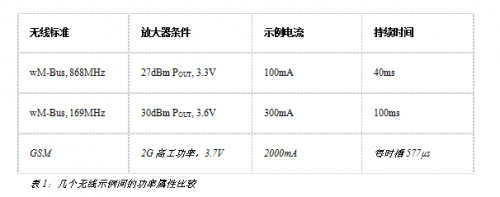 表1中显示的是三种常见标准之间的比较。每个标准具有一个典型的无线电放大器功率条件,以及传输持续时间内所需要的电流。