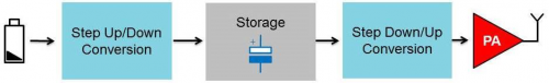 为了实现所述的脉冲负载运行,需要考虑全新的电源管理概念。由于电池不能传送所需的电流,在无线电未激活时,要将所需的能量储存起来,使其可以在无线电被激活时使用。为了实现这一点,需要设计一个全新的电源概念来缓冲能量,并且将负载峰值从电池上去耦合。可用于能量缓冲的比较好的介质是储能电容器,因为它们能量密度高和电容值大。