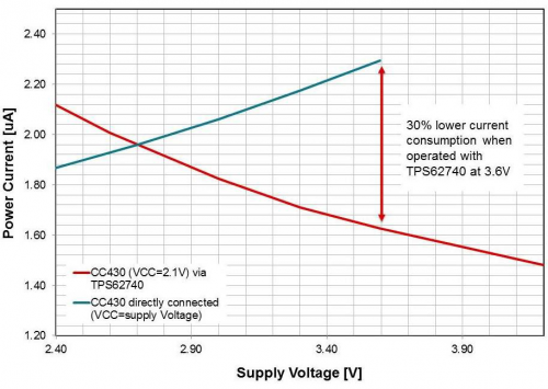当SoC与一个超低功耗降压转换器组合在一起使用,以减少电源电压时,流耗被进一步减少。这些是静态电流为几百分之毫微安培的降压转换器。蓝色迹线显示的是,把电源电压降压至2.1V后,这个应用汲取的电流。电池电压越高,节省的电能就越多,其原因来自高效的降压转换。在3.6V的典型LiSOC12电池端子电压上,总体流耗比直接电池连接下降了30%。