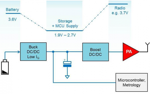 要求最低静态电流器件同时具有高功率是对电源架构的一个挑战。通过将所需能量存储在一个EDLC中,使用“降压-储能-升压”的能量缓冲概念可以解决负载峰值去耦合的问题。由于微控制器的电源电压较低,它还可以实现更低的总体功耗。由于储能电容器使用一个较低电压,所以安全问题和顾虑更少。这个概念可以将储能电容器中缓冲的能量与更低的总体流耗组合起来,以实现更长的应用运行时间。