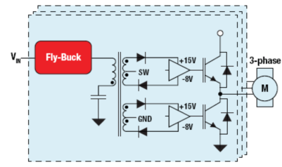 另外一个常见的应用领域是隔离式DC/DC转换器或电机控制中的栅极驱动偏置电源。MOSFET、IGBT,或基于碳化硅 (SiC) 的功率级需要隔离式电源轨作为驱动器,以及控制电路供电;而这些驱动器或控制电路也许与电源不在同一侧,而是位于隔离边界的另一侧。高侧驱动器还需要浮动偏置电源轨;这些电源轨用高达数百伏电压与低侧电源轨分离开来(图2)。参考设计2是一个完整的,针对3相电机控制系统的Fly-Buck偏置电源设计。