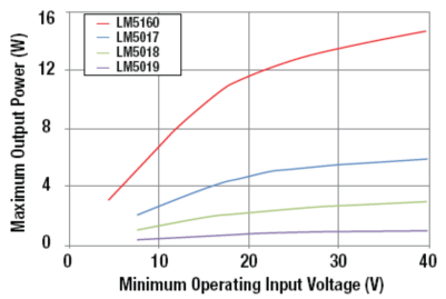为了保持良好稳压,Fly-Buck转换器的占空比应该保持在50%以下 (D < ½)。这就为Fly-Buck转换器的实际使用设定了一个最大输出功率限值。在较低的输入电压下,可用功率随着输入电压呈线性增加。在较高输入电压下,功率输出受到部件的最大电流能力和输出电压的限制。初级侧上15V的最大输出电压 (VOUT1) 通常能够满足大多数实际应用的需要。用户可以按照图9中数据为TI的Fly-Buck转换器选择最大输出功率(它是最小工作输入电压的函数)。