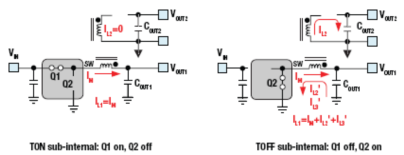 Fly-Buck转换器是一个同步降压转换器,其中的电感器被耦合电感器或反激式变压器所取代。次级输出电压 (VOUT2) 由一个对次级绕组进行整流的二极管生成。如图7所示,当同步开关 (Q2) 接通时,初级输出电容器 (COUT1) 在每个开关周期内对次级输出电容器 (COUT2) 充电。