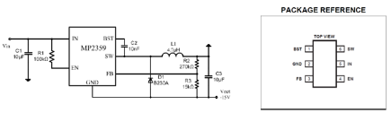 从图6的拓扑中可以看出输入电压与输出电压极性是相反的,因此Buck-Boost拓扑结构又简称为倒相拓扑。图7是采用MP2359DT设计的-15V电源电路,MP2359DT是采用SOT23-6的封装,整个电路占用PCB面积较小。