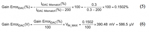 明确规定IDAC失配要用%FSR表示。因此,可计算增益误差及产生的输入相关电压误差。这在下面的方程式(5)和方程式(6)中进行了展示。