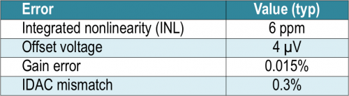 由于到ADC的输入是电压,所以积分非线性(INL)误差、增益误差和IDAC失配误差必须被转换为输入相关电压。表2和表3诠释了一个范例式系统。该系统用来计算作为输入相关电压的误差。选择电路的值超出了这些规定的范围,这些在TI的参考设计TIPD120中得到了详细的说明。