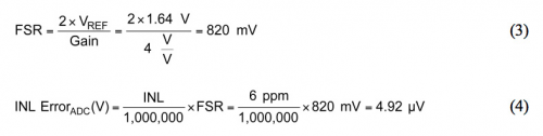 明确规定INL要用ADC满量程范围的百万分率(ppm)表示。INL不是增益误差。因此,必须让它乘以ADC的满量程输入电压,而不是RTD电压最大值。用方程式(3)可计算出该配置中的满量程输入,用方程式(4)则可计算出输入相关INL误差。