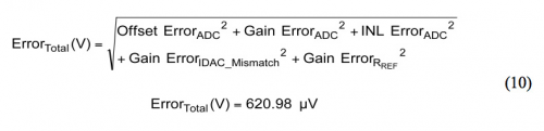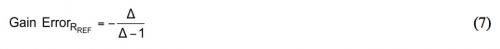 最后一个重要的误差源是RREF的公差,它会在ADC传递函数中产生增益误差。凭借用来计算IDAC失配增益误差的相同方法也可计算出RREF引起的增益误差。方程式(7)展示了最终结果。