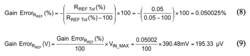 假设RREF公差被明确规定为0.05%,那么按方程式(8)所示可计算出增益误差。用方程式(9)则可计算出输入相关误差。
