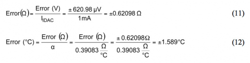 方程式(11)和方程式(12)展示了如何把表4中的总电压误差转换为以欧姆为单位的误差,并最终转换为以摄氏度为单位的误差。借助Pt100 RTD的灵敏度α,按IEC-60751标准所规定的,能把以欧姆为单位的误差转换为以摄氏度为单位的温度误差。