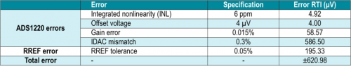 使用表3中的范例式电路配置,现在可认为误差源与输入相关,并可将误差源与RTD电压最大值(0.39048V)相比较。