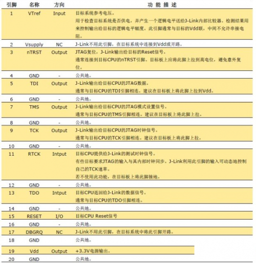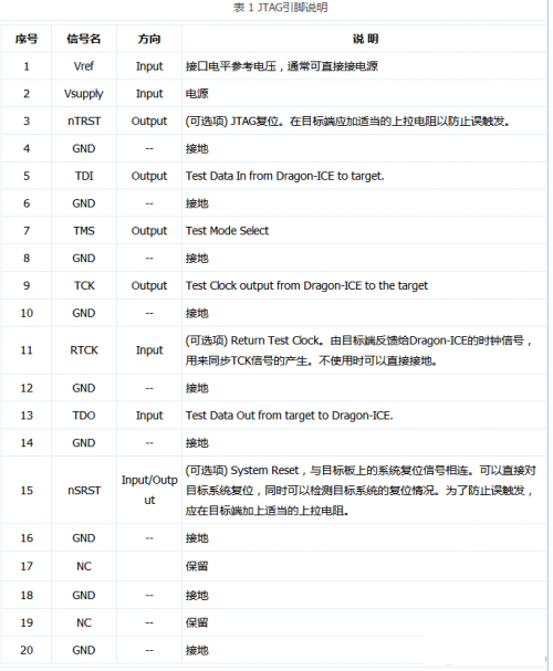 接口是一个20脚的IDC插座。下表给出了具体的信号说明: