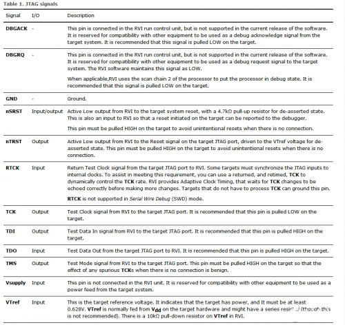 说明: 1脚:通常连接到目标板的vdd,用来检测目标系统是否供电;检测原理上图中有简单的说明。 2脚:原版的JLink这个引脚没有使用,不提供Vsupply输出,而很多改造版的JLink通过跳线选择从该引脚输出3.3V的电压给外边,我的就是这样的。 JTAG interface signals The following table describes the signals on the JTAG interfaces: