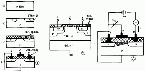 图1是典型平面N沟道增强型MOSFET(场效应管) 的剖面图。它用一块P型硅半导体材料作衬底(图la),在其面上扩散了两个N型区(图lb),再在上面覆盖一层二氧化硅(SiQ2)绝缘层(图lc),最 后在N区上方用腐蚀的方法做成两个孔,用金属化的方法分别在绝缘层上及两个孔内做成三个电极:G(栅极)、S(源极)及D(漏极),如图1d所示。