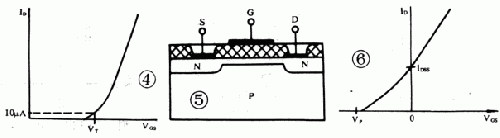 由于这种结构在VGS=0时,ID=0,称这种MOSFET(场效应管)为增强型。另一类MOSFET(场效应管),在VGS=0时也有一定的ID(称为IDSS),这种MOSFET(场效应管)称为耗尽型。它的结构如图5所示,它的转移特性如图6所示。VP为夹断电压(ID=0)。