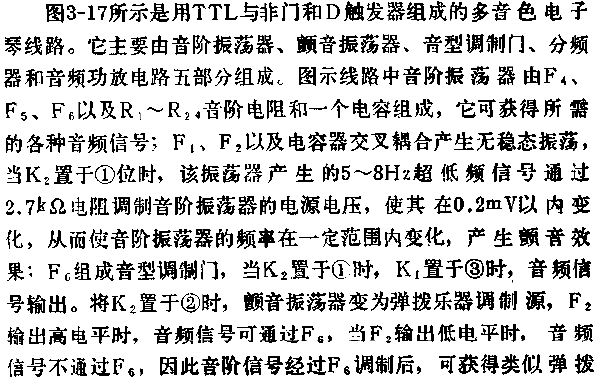 乐器或其它某些乐器的碎音效果;分频器由D触发器组成,当K1置于2位时,D触发器将F6输出的类似双簧管音阶信号从CL端输入,经二分频后从Q端输出,这声音很象黑管;音频功放采用互补型,不赘述了。调整颤音振荡器620欧和1K电阻的数值可改变颤音的弹拨乐音型的调制频率。