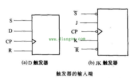 触发器的数据输入端,标注有字符“D,J,K……”等,如下图所示