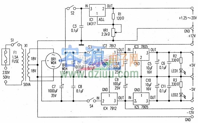 附图为三路电源供给电路。降压电源变压器将220V交流电源降低至18V-O-18V后用全波整流电桥BR1整流,C1、C2、C3、C7和C8滤波,然后用稳压器IC1~IC5分别稳压。稳压器IC1(LM317)输出可变电压1.25V~20V;IC2和IC4分别输出稳定的+12V和-12V。