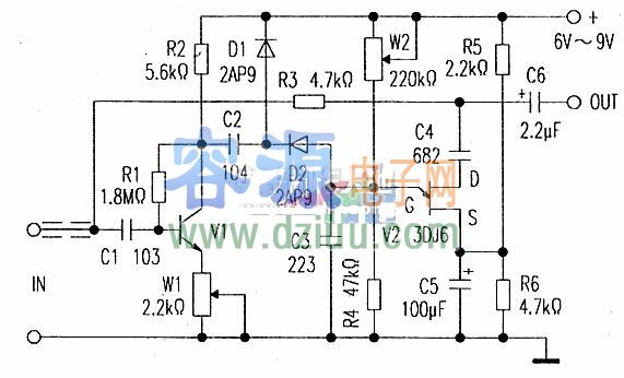 电路原理见下图。输八信号分成两路,一路经R3、C6到输出端。V2是结型场效应管,在电路中作压控电阻使用,它的源极电压由R5、R6的分压比确定。C5是旁路电容,微调W2用以调节V2栅极电压,使其在无信号输八时略呈反偏,其源、漏极间电阻约为100Ω,阻值较小,因而为C4通过V2漏源极并经C5到地提供了交流通道。