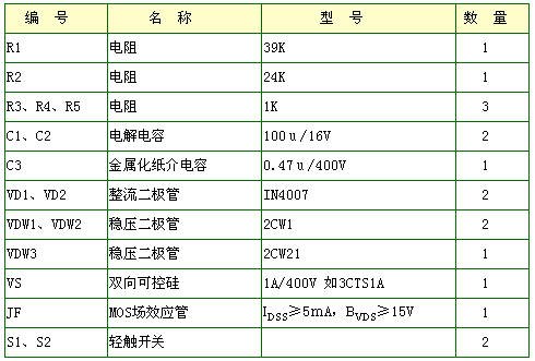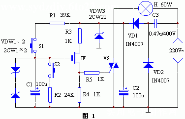 如图所示,VD1、VD2、C2、C3组成电容降压式直流电源,由MOS场效应管、C1等组成双向可控硅VS的触发电路。DW为保护二极管,防止场效应管栅极击穿。当按下S1时,由R1向C1充电,使栅极电压上升,双向可控硅的触发电流上升,导通角变大,光线增加,当按下S2时,C1沿R2放电,栅极电压下降,双向可控硅的导通角变小,光线变暗。当S1、S2都放开时,由于MOS场效应管的栅源电阻很大,C1两端的电压将基本不变,所以可控硅的导通角也将不变,光线稳定下来。场效应管JF的IDSS≥5mA,BVDS≥15V,可控硅VS选用1A/400V即可,如3CTS1A等。其它元件无特殊要求,具体数值已标在图中。电阻R1、R2的数值决定了电容C1的充放电时间。在制作时,若光线变化太快时,应适当增大R1、R2的数值,反之应减小。电路实用性非常大,在制作调试时,要耐心调试,一定会达到最佳效果。下面是元器件参数表: