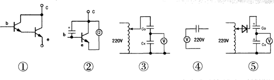 方法l:找一个β≥250的晶体三极管(要求穿透电流要小),如一时找不到,两只同型号的三极管复合成达林顿形式,见图1。将被测电容并接在三极管的c-e结(若为有极性电容则电容正极接三极管c极),然后用万用表R×10k挡,黑表笔接c极,红笔接e极,见图2,观察表针瞬时摆动程度。照此法用几个已知容量的正常(高精确度)的电容反复测试,记录下表针每次的瞬时最大摆动幅值,l进行计算,算出表盘上每小格应代表的电容值,备日后参考之用。对电容进行测量时,通过对所测电容表针摆动幅度与参考幅度进行比较可判断电容的好坏。