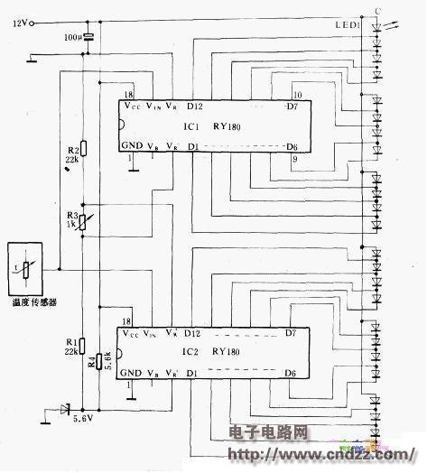 基于RY180制作的光带式模拟温度计电路图