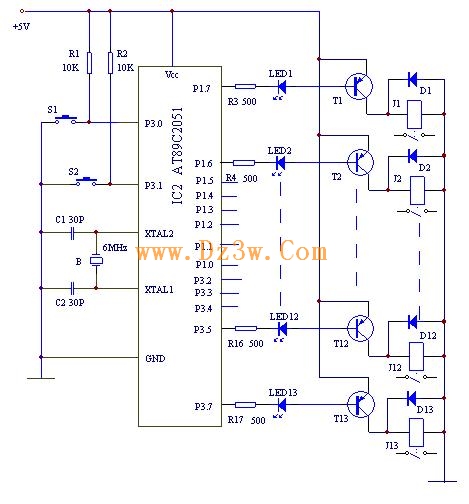 轻触式步进调整控制电路主要由AT89C2051与微型继电器构成,电路如图二所示。P3.0和P3.1作输入端口,分别接上拉电阻R1、R2和轻触开关S1、S2,S1做步进调整开关,S2做退步调整开关。P1.7~P1.0和P3.2~P3.7共13个口作输出端口,每一个端口用一颗发光二极管与PNP型三极管基极相连接,输出信号经过三极管放大后驱动微型继电器工作,发光二极管起到连接输出信号和显示输出信号的作用。微型继电器的常开或常闭触点与外围电路联接,通过控制微型继电器的触点闭合或断开来达到控制外围电路作步进调整工作。