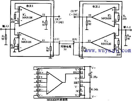 一般同轴电缆通信均用双电缆制,一条电缆发送,一条电缆接收。如采用单电缆传输的办法则可节省一根电缆,但这只对音频信号来说比较容易实现,对频率为几兆赫的信号,由于要用到高速放大器并要解决阻抗匹配问题,所以就显得非常困难。此电路可提供对单根同轴电缆进行双向驱动功能,按图中元件标示的值适用于50欧系统,稍作改进后即可适用于75欧系统。