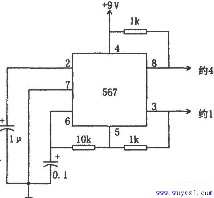 567为音频译码器,主要用于自动电话系统,识别收到的电话音调。该集成块的核心是一个高可靠性、高精度锁相环。按图示连接方式和使用的元件数值,两个输出信号频率分别为1.5kHz和4kHz.如下图所示: