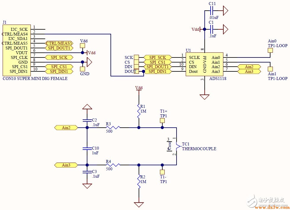 此设计概括了提供传感器诊断所必需的抗混叠滤波器和偏置电阻器。此示例还提供了一种新颖的方式,即使用 ADS1118 上的板载温度传感器完成对系统的冷端补偿。对于热电偶线性化,此设计还提供了一种非常简单的、可以在大多数微控制器上实施的线性算法。  特性  测量 K 型热电偶温度  精度 1 °C  高精度/可重复性 0.2°C  包含冷端补偿  包含软件算法  使用 ADS1118 16 位 ADC(带 PGA)  原理图/方框图