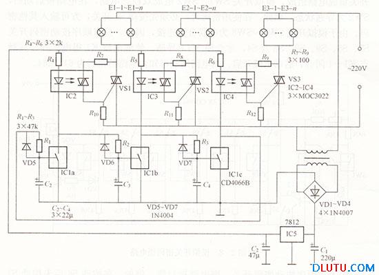 流水灯控制电路如图所示。电路中的IC1a、E1b及IC1c为CD4066B中的三个电子开关,IC2、IC3、IC4为晶闸管光耦器件,电源接通时均处于断开状态。12V直流电源分别经R准、R5、R6、Iα~Iα中的发光二极管及Rl~R3对电容C2~C3充电。由于电阻R1~R3阻值较大,流过发光二极管的电流很小,所以不会触发晶闸管导通。