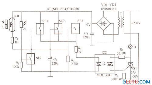 门厅灯自动开关电路如图所示。IC1是一块模拟开关CD4066,其中的SE1、SE2、SE3电子开关用于延时,并经R4驱动光耦合器IC2和晶闸管VS1,以便对照明灯H进行控制。电子开关SE4与光敏电阻RL等元件构成环境光线检测电路。KR为干簧继电器,其触点为动断状态,它与R1、R3及C1构成充放电回路。干簧继电器KR及全部电路安装在门框上,在房门对应的位置上固定小型永久磁铁,形成磁控开关,当门关闭时,在永久磁铁的作用下,干簧继电器KR的触点断开,使电子开关SE1~SE3的控制端经R3接地,所以SE1~SE3处于断开状态,IC2及V⒊均为阻断,照明灯H不亮。