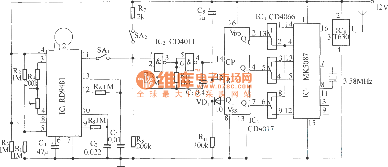本电路采用微波传感模块RD9481作为探头,使用DTMF(双音多频)编码译码,由长波收发组件T630/T631进行报警信号和地址的传送,可显示报警地点,适用于多路(16路)集群监控报警系统。 本电路由分机和主机组成,除地址编码不同外,各报警分机电路均相同.报警分机电路: