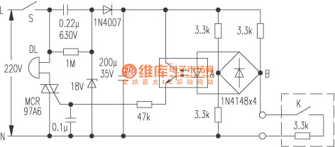 报警器电路见图。图中检测电路采用电阻桥,储藏室门开关采用磁控开关,门关接通,门开断开,储藏室门开关与电桥的一个电阻构成电桥的一臂,安装在储藏室内。这样,若门被撬开,则磁控开关断开;又若外线被短接或者断路,无论哪种情况,都会使桥路失去平衡,A、B两端电压经整流桥的1N4148使光耦工作,从而使双向可控硅导通,电铃发出报警信号。